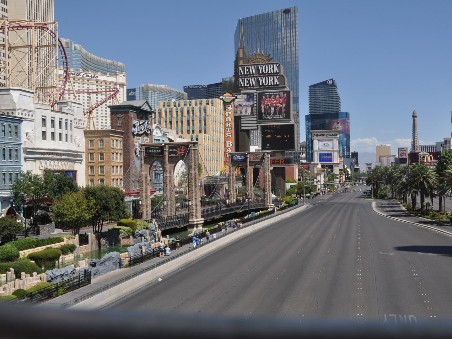 Naar de mono rail die tussen het Mandalay Bay hotel, het Luxor hotel dat helemaal in als een Egyptische piramide is gebouwd en het Excalibur hotel, helemaar in Disney stijl. We waagden het om een stukje te lopen. Langs het imposante New York hotel met het Vrijheidsbeeld. Weer even afkoelen in de M&M winkel waar je op 4 etages alles kunt kopen in de vorm van een M&M snoepje.