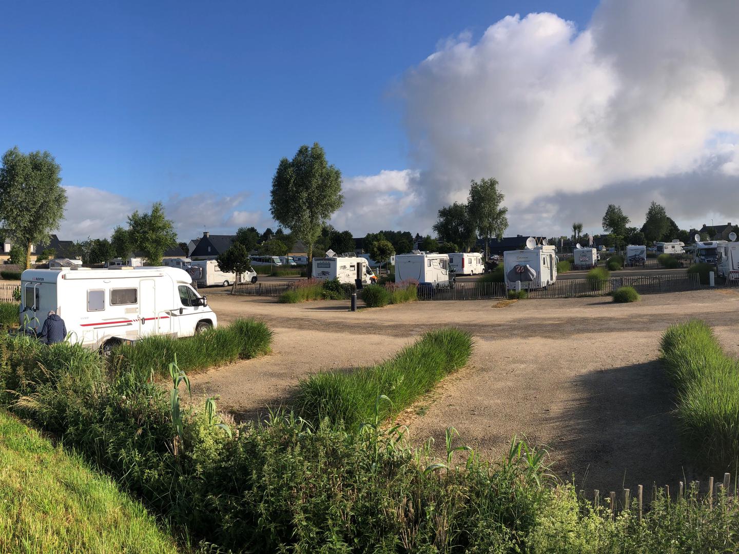 Na een korte stop zijn we doorgereden op zoek naar een overnachtingsplaats bij Mont Saint Michel. De eerste plek die we hadden uitgekozen, een camper plaats bij een pannenkoeken restaurant. Maar de plek was verlaten en lag direct aan de grote weg. Dus een andere plaats gevonden. De Aire du Mont Saint Michel. Een hele grote camper plaats waar nog ruim plaats was. Het kostte even moeite om uit de vinden hoe je de slagboom kon openen. Maar er stond een automaat waar je met je pinpas kon betalen om een code te ontvangen. En met die code ging de slagboom open.